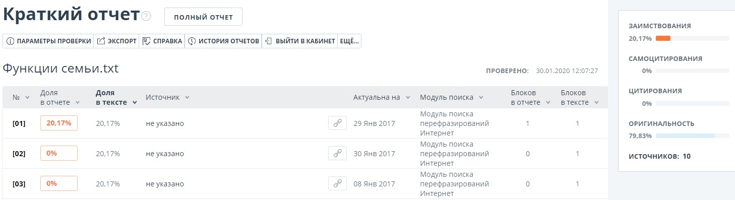 Если преподаватель разрешил доступ к отчёту по загруженному документу, то в строке с работой появится кнопка «Отчет». После нажатия на кнопку «Отчет» откроется страница с кратким отчетом. Краткий отчет представляет собой распределение процентов оригинальности, заимствования и цитирования, а также список источников заимствования.