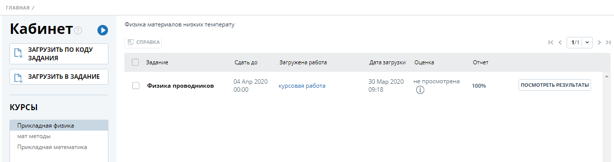 Кабинет предоставляет возможность загружать в задание документы на проверку. Для доступа к загрузке документов нажмите на «Меню» и выберите раздел «Кабинет студента». На странице кабинета вы увидите панель «Курсы» и «Задания». Выбрав нужное задание, отобразится загруженная работа и информация о загрузке и проверке документа.