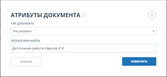 При добавлении документы сопровождаются кратким описанием их параметров – атрибутами. Для редактирования атрибутов документа выделите галочкой нужный документ и нажмите «Изменить название и тип» в верхнем меню. В открывшемся окне вы можете изменить название документа и присвоить тип документа.
