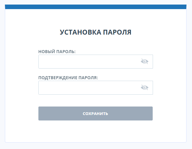 На открывшейся странице введите пароль и его подтверждение. Кнопка "Сохранить" становится активной, если введенный пароль удовлетворяет требованиям и пароли в полях "Новый пароль" и "Подтверждение пароля" совпадают. Вы можете предварительно убедиться, что пароль введен правильно, нажав на кнопку видимости в правой части соответствующего поля. После этого вместо точек отобразятся символы.