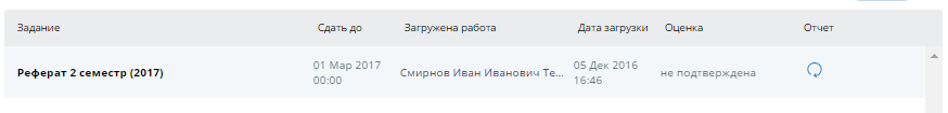 Документ отправится в кабинет преподавателя, которому принадлежит задание. До тех пор, пока преподаватель не подтвердит вашу работу, в графе «Отчет» будет стоять символ «работа проверяется», в графе «Оценка» - статус «не подтверждена». После подтверждения преподавателя, вы увидите результаты проверки.