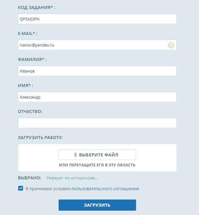 Если код задания верен и пользователь с указанным e-mail не зарегистрирован в системе, то откроются дополнительные поля для заполнения. Заполните их, выберите файл, который хотите отправить на проверку, и примите условия пользовательского соглашения. Затем нажмите «Загрузить».