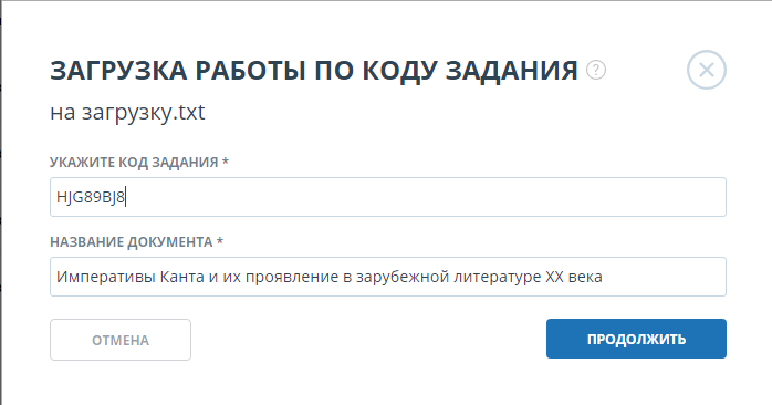 Чтобы загрузить студенческую работу по коду задания, который сообщил вам преподаватель, нажмите на кнопку «Загрузить по коду задания», выберите документ для загрузки и введите код задания, при необходимости измените название для вашей работы. Затем нажмите «Продолжить».