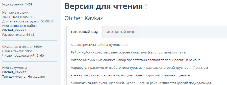 Чтобы просмотреть текст загруженного документа, нажмите на его название в списке документов. Откроется страница «Версия для чтения», на которой отображается текст документа в постраничном режиме.